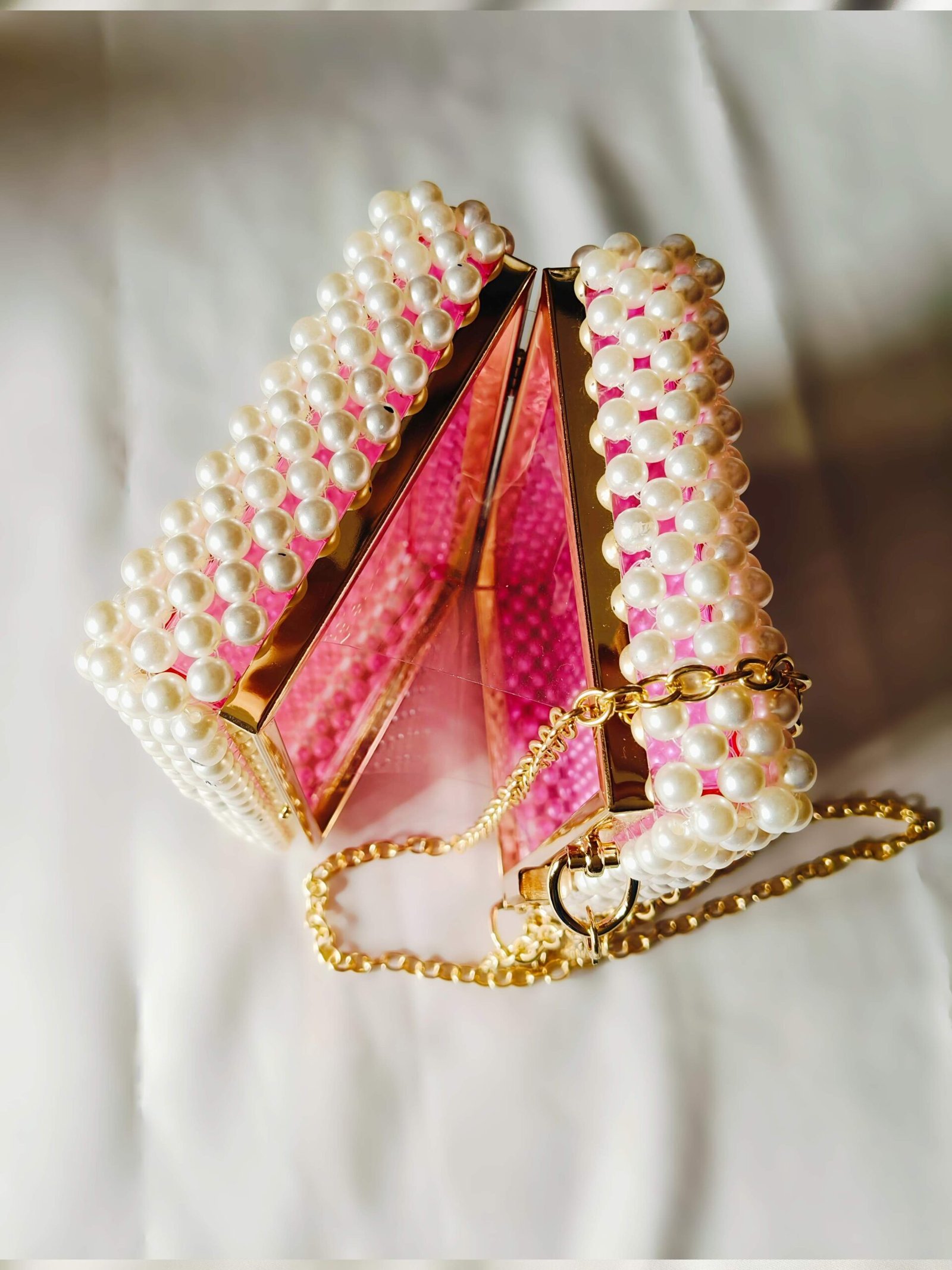 Un classico che non passa mai di moda. Questa clutch a perle avorio è intrecciata a mano con una griglia regolare di perle lucide su base rosata che dona profondità e calore al colore. La tracolla a catena dorata permette di indossarla a spalla o crossbody, mentre il formato rettangolare offre spazio per smartphone, chiavi, mini portafoglio e rossetto.